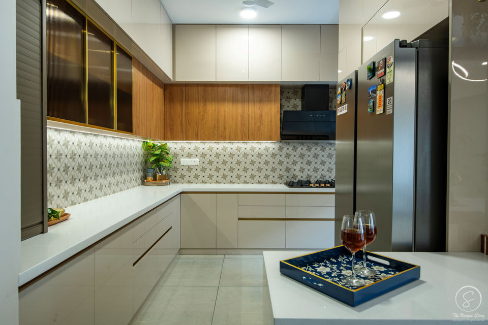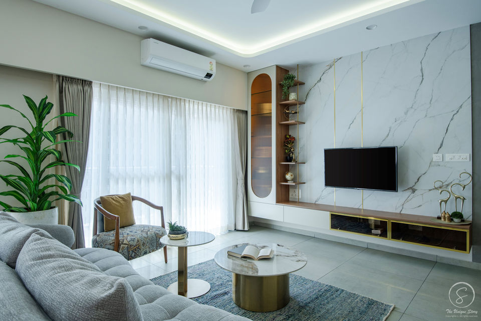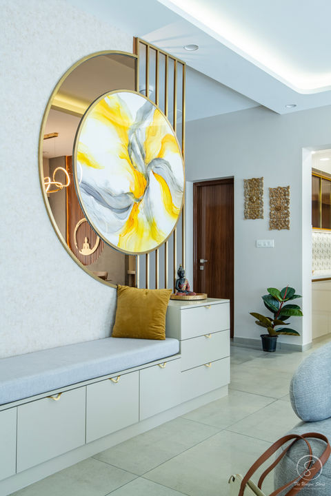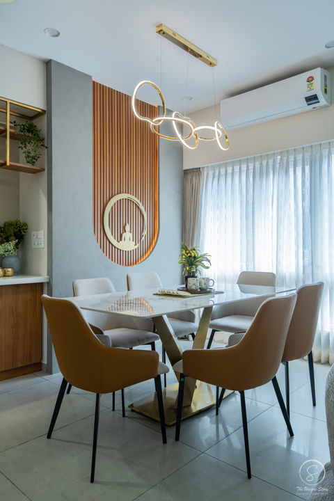 This contemporary villa was designed to blend modern aesthetics with Vastu-compliant principles, ensuring harmony in every space. From furniture placement to colour choices, every detail followed the Vastu consultant’s guidance, while still embracing a stylish, warm palette of brown, beige, and gold. The highlight of the home is the golden partition in the corridor seating area — one side adorned with luxurious wallpaper, the other with a reflective bronze mirror, adding depth and drama. The Buddha-inspired accent and a charming breakfast nook create focal points that make the heart of the home truly unique. A sleek lacquered Aristo wardrobe and a rich accent wall define the master bedroom, while the guest room, study, and mandir blend functionality with understated elegance.